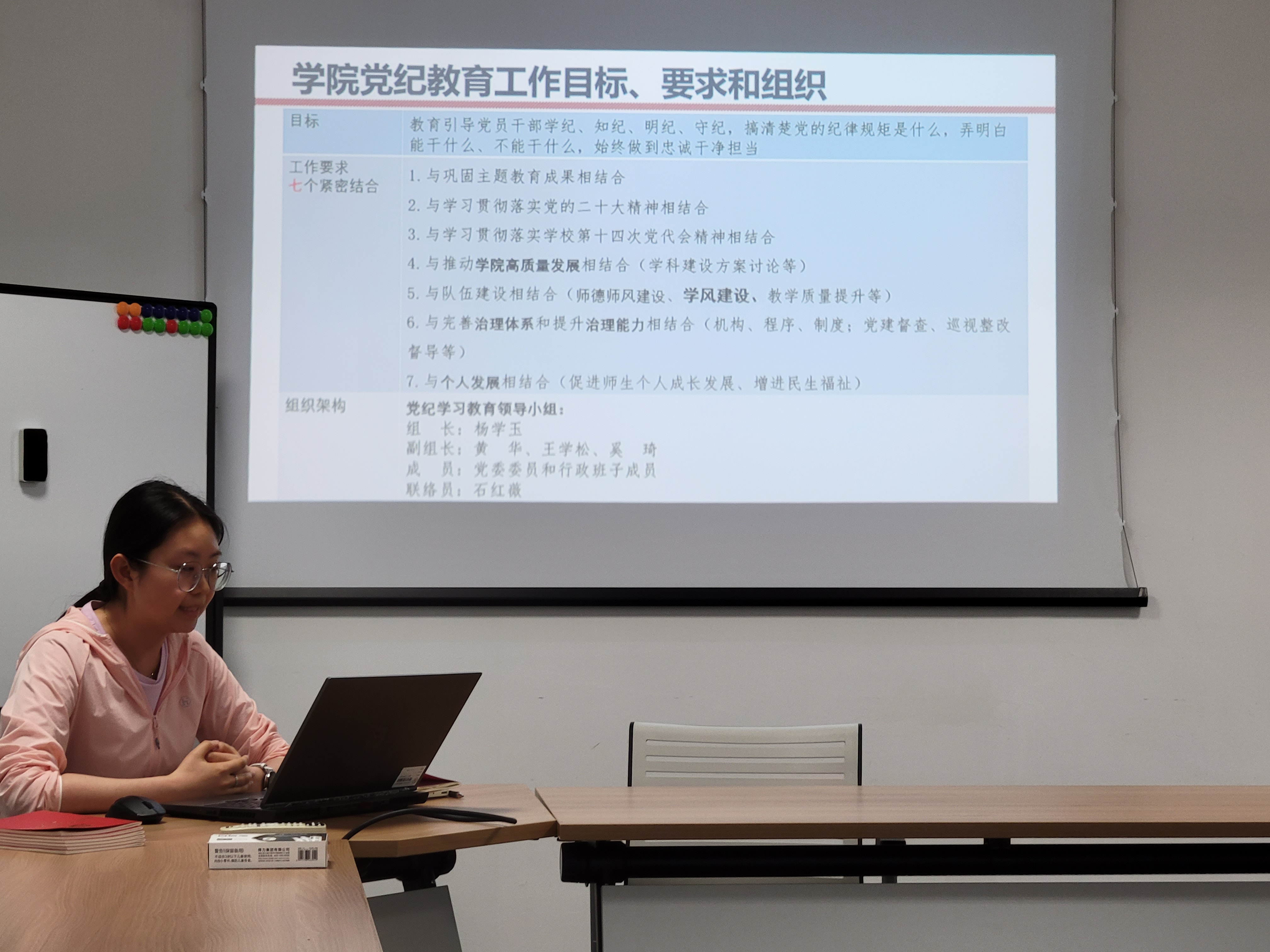 会议首先强调各支部要切实贯彻落实党纪学习教育的目标和要求,依照支部计划高效有序地开展系列学研实践活动,原原本本、逐章逐句学习《中国共产党纪律处分条例》。会议上,石红薇老师带领全体支部书记集中学习《中国共产党纪律处分条例》,深入探讨学生党员应遵守的纪律要求、违纪行为的认定标准以及相应的处理程序。引导学生党员正确认识党纪纪律、严格遵守党规党纪,不断提高政治理论水平和党性修养。会议要求各支部书记要带头上党课,纪检委员担起担子,引领支部全体党员共同学习。