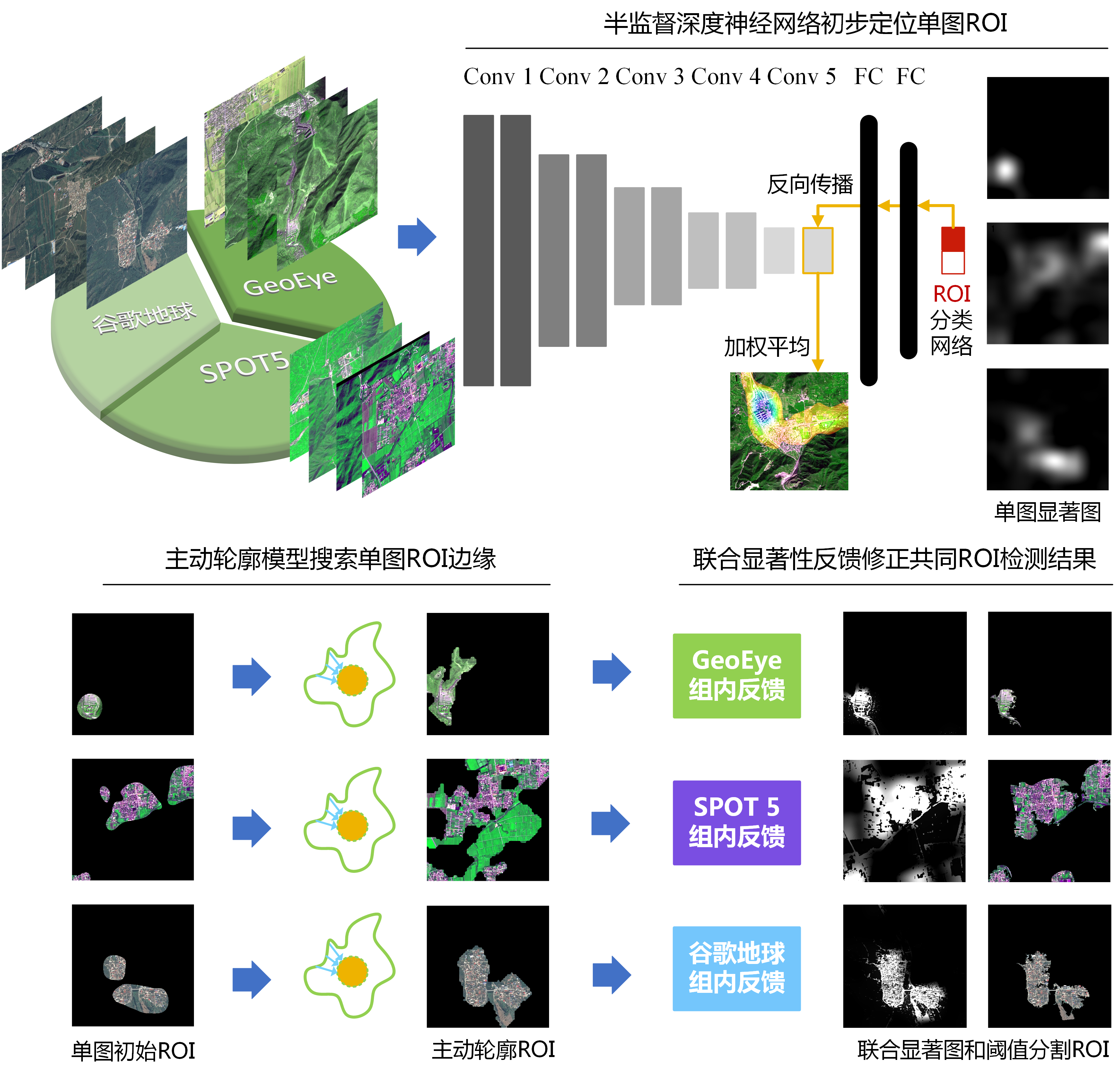本文从基于深度神经网络的弱监督学习、主动轮廓模型和联合显著性分析三个方面展开研究,提出了多源遥感影像的联合显著性分析模型,以实现从来自不同数据源的遥感影像中,提取在高层语义上属于同一类别的感兴趣区域。