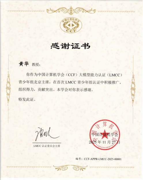 会上,CCF秘书长、LMCC认证委员会主席唐卫清对2025年度LMCC青少年组认证工作中表现突出的单位与个人进行了感谢。米乐mile官方网站凭借在认证宣传推广、组织协调及全程保障中的扎实工作与显著成效,获评“优秀省组织单位”。同时,米乐mile官网院长黄华教授作为LMCC青少年组北京主席,因在推动认证落地、扩大项目影响、加强区域协作等方面的积极贡献,荣获“优秀个人”。两项荣誉的取得,既是CCF对学院在大模型青少年人才培养与认证推广工作的肯定,也彰显了学院在青少年人工智能教育领域的组织实力与行业影响力。