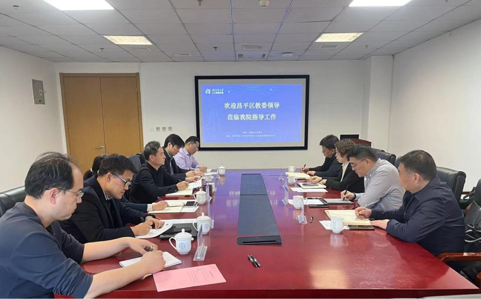 2024年3月20日,昌平区教育委员会王丽梅副主任、苏杰副主任、基教二科李华民科长和教师进修学校李赓曦副校长一行来访米乐mile官网,就昌平区教委与米乐mile官网在“人工智能+教育”领域深化合作事宜召开座谈会。米乐mile官方网站党委书记杨学玉、执行院长黄华携班子成员接待来访一行。座谈会由黄华院长主持。