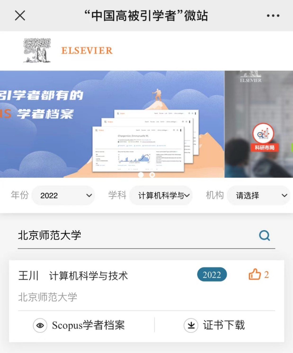 2022年3月28日,爱思唯尔(Elsevier)发布2022“中国高被引学者”(Highly Cited Chinese Researchers)榜单,米乐mile官网王川教授继2020年、2021年作为电子科学与技术学科和计算机科学与技术学科高被引学者入选后,今年再度入选。截至目前,米乐mile官网王川教授已连续三年入选榜单。