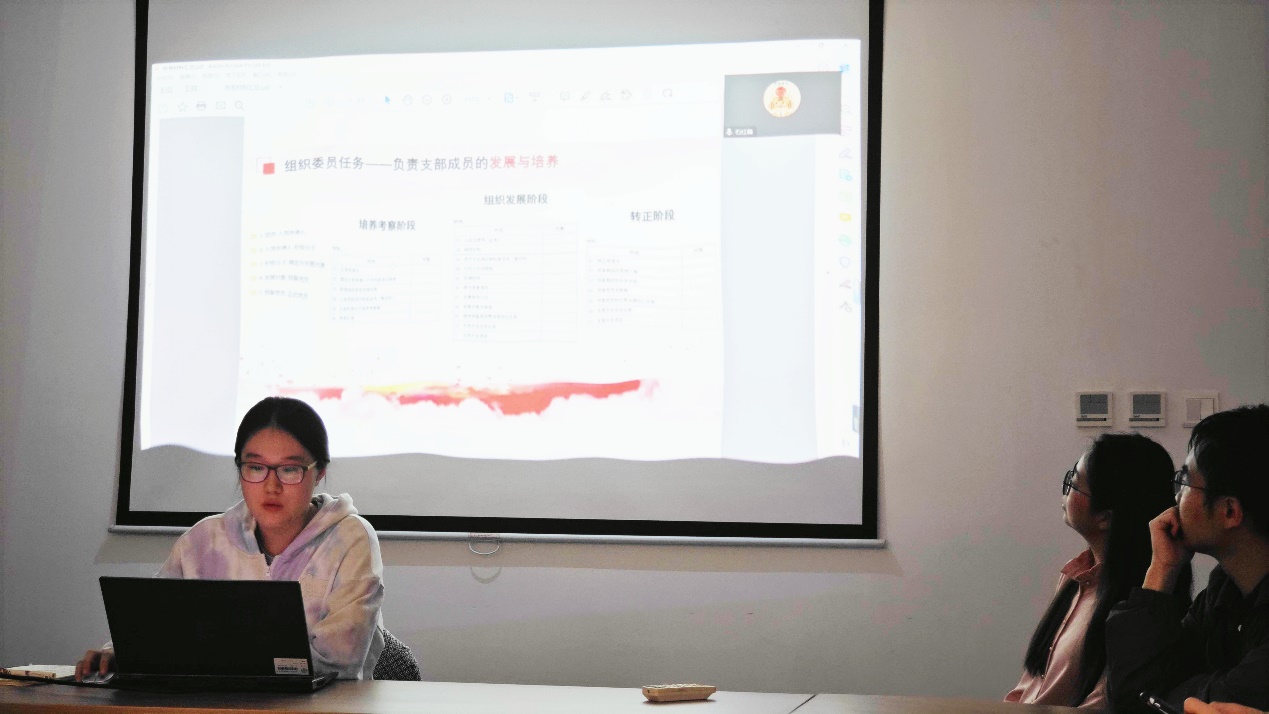 此后,由硕士第四研究生党支部的郑思宇同志为大家讲解发展党员各个阶段所需要的材料,并希望新任党支委认真阅读发放的相关材料,更好地完成支部工作任务。接着,由硕士第四研究生党支部的宋澳华同志为大家补充介绍支部日常管理的相关内容,具体介绍了组工系统和党员E先锋系统的使用方式和日常维护流程,包括收缴党费、党组织转入转出等系统操作方式,同时宋澳华同志也将自己身为前支部书记的宝贵经验传授给大家,在座各位都感到受益匪浅。