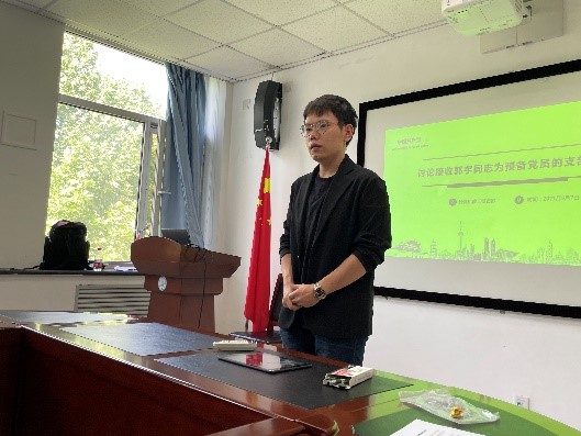 郭宇随后发表感言,他表示能在建党100周年之际成为预备党员,感到无比的自豪和荣耀。从今以后将更加积极的向党组织靠拢,踏实的按照党的教育方针落实工作,严格要求自己,要经得起党组织和各位老师的考验,不辜负党组织的期许,争取早日成为一名优秀的中共正式党员。