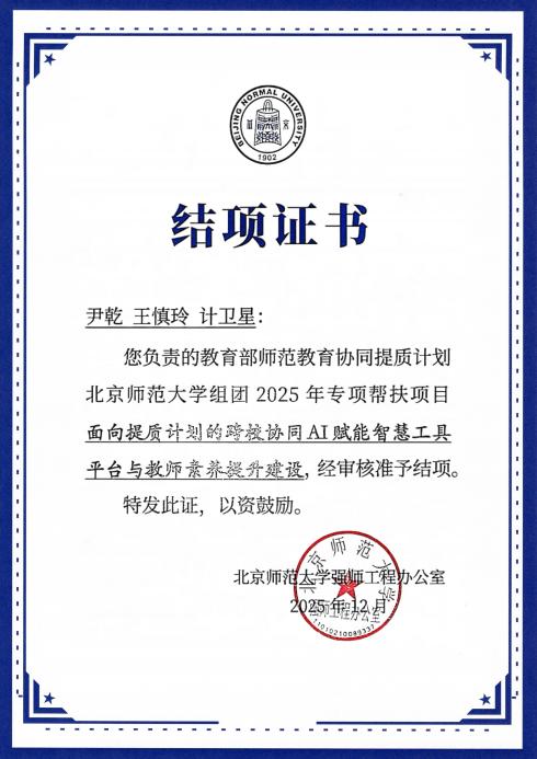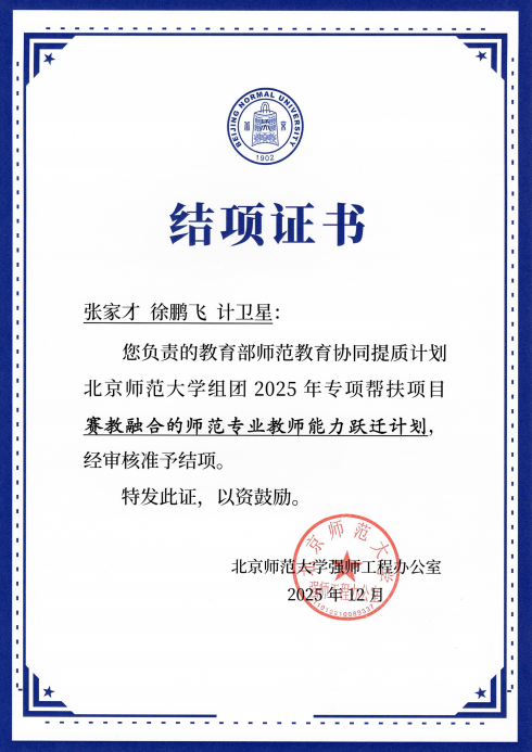 米乐mile官网张家才教授牵头负责的《赛教融合的师范专业教师能力跃迁计划》、尹乾教授牵头负责的《面向提质计划的跨校协同AI赋能智慧工具平台与教师素养提升建设》两个专项帮扶项目顺利结项并获颁结项证书。