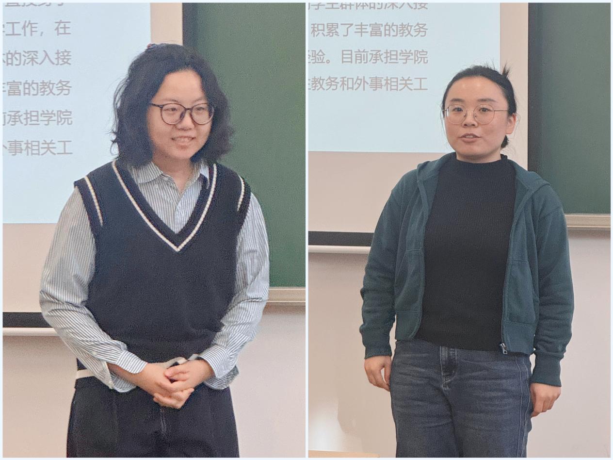 随后,会议介绍了本学期新入职的教师。本学期,学院师资与管理队伍迎来了两位新成员:钟瑶瑶老师作为新引进的青年教师,将专注于教育大模型研究方向;高丽老师则加入学院行政团队,负责研究生教务及外事管理工作。二位老师在会上分别进行了自我介绍,他们的到来,进一步充实了学院的教学科研力量与行政服务支撑体系。