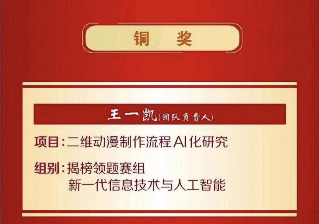 米乐mile官网王一凯副教授作为《二维动漫制作流程AI化研究》项目负责人,参加了“揭榜领题赛”中“新一代信息技术与人工智能”赛道的比赛,从项目核心技术、团队构成、研究计划及合作成果四个方面进行了汇报路演与答辩,并荣获该赛道铜奖。