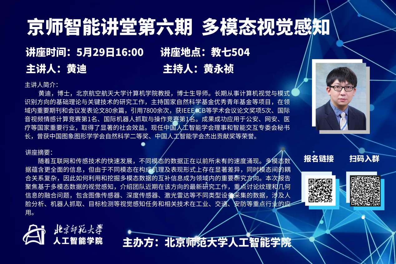 简介:黄迪,博士,北京航空航天大学计算机学院教授,博士生导师。长期从事计算机视觉与模式识别方向的基础理论与关键技术的研究工作,主持国家自然科学基金优秀青年基金等项目,在领域内重要期刊和会议发表论文80余篇,引用7800余次,获IEEE ICB等学术会议论文奖项5次、国际音视频情感计算竞赛第1名、国际机器人抓取与操作竞赛第1名。成果成功应用于公安、网安、医疗等国家重要行业,取得了显著的社会效益。现任中国人工智能学会理事和智能交互专委会秘书长,曾获中国图象图形学学会自然科学二等奖、中国人工智能学会杰出贡献奖等荣誉。