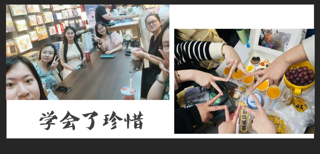 不幸的是,我与另外5位同学并不是同一专业,不仅缺少了关键的上课搭子,更是由于课程的不同导致了几乎错开的作息,和很难凑到一起玩的时间。但最幸运的是,我们有着说不完的话题,四年间宿舍里永远都会传出“未见其人,先闻其声”的杠铃般的笑声。我们一起跨年,玩桌游、吃零食、看跨年晚会,把仪式感拉满;我们一起玩飞行棋、打扑克,有人已经从“思琪”变成“马思琪”,尽显求胜的嘴脸;我们一起在“分手厨房”里相互diss,一起在KTV里抒发“向天再借500年”的豪情壮志,一起在专业实习课上为了“植物大战僵尸”哀嚎……遇见你们何其有幸!和大家在一起的回忆都是快乐的,幸福的。写完这一段,在熄灭的电脑屏幕上看到了我上扬的嘴角和笑眯眯的眼睛,heart暖暖的。
